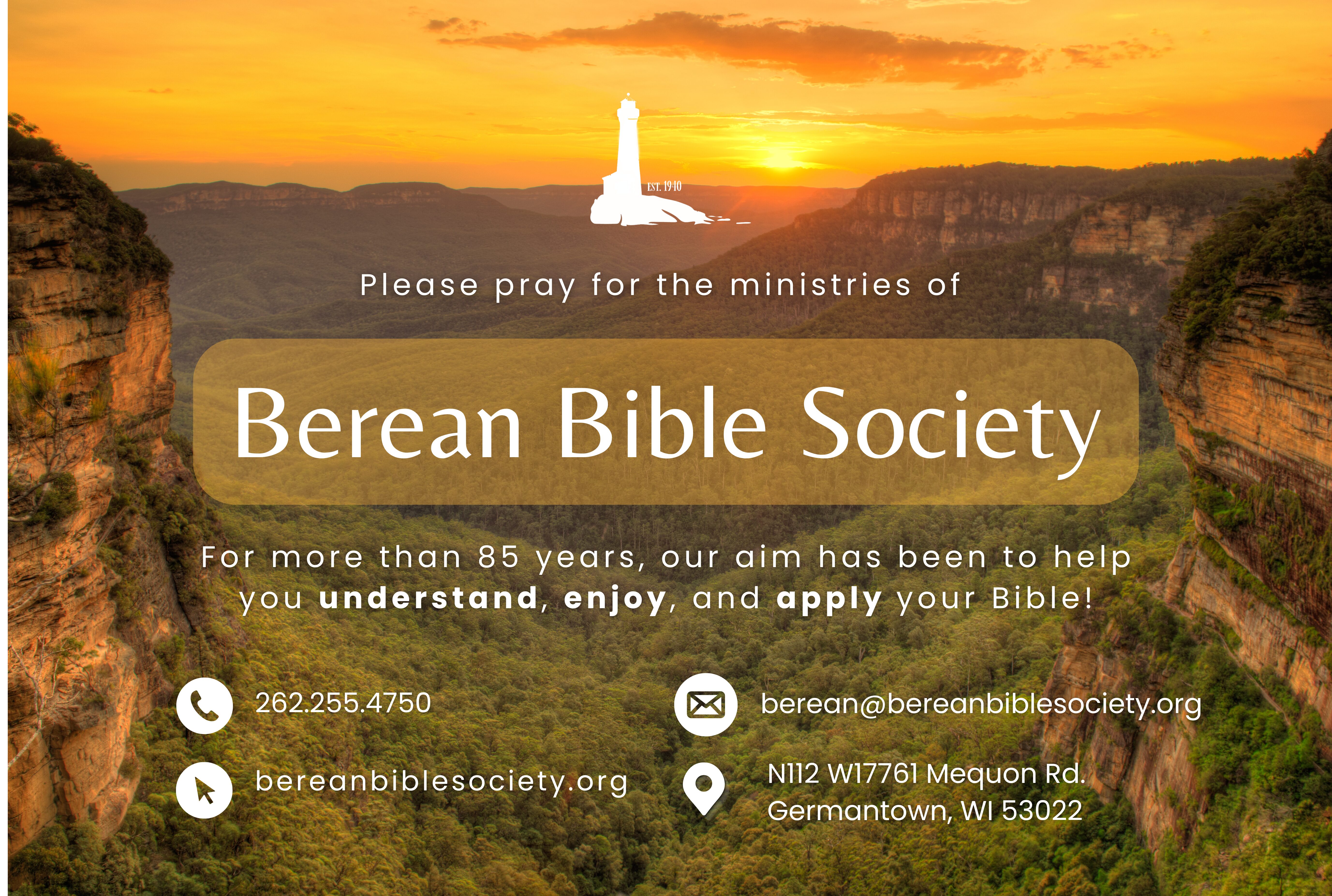 We are looking forward to serving the Lord in our new location for many, many years to come. May God richly bless His Word as it goes forth to the praise of His glory. If you have any questions regarding the ministries of the Berean Bible Society, please feel free to contact us using the contact information at the bottom of this page.
