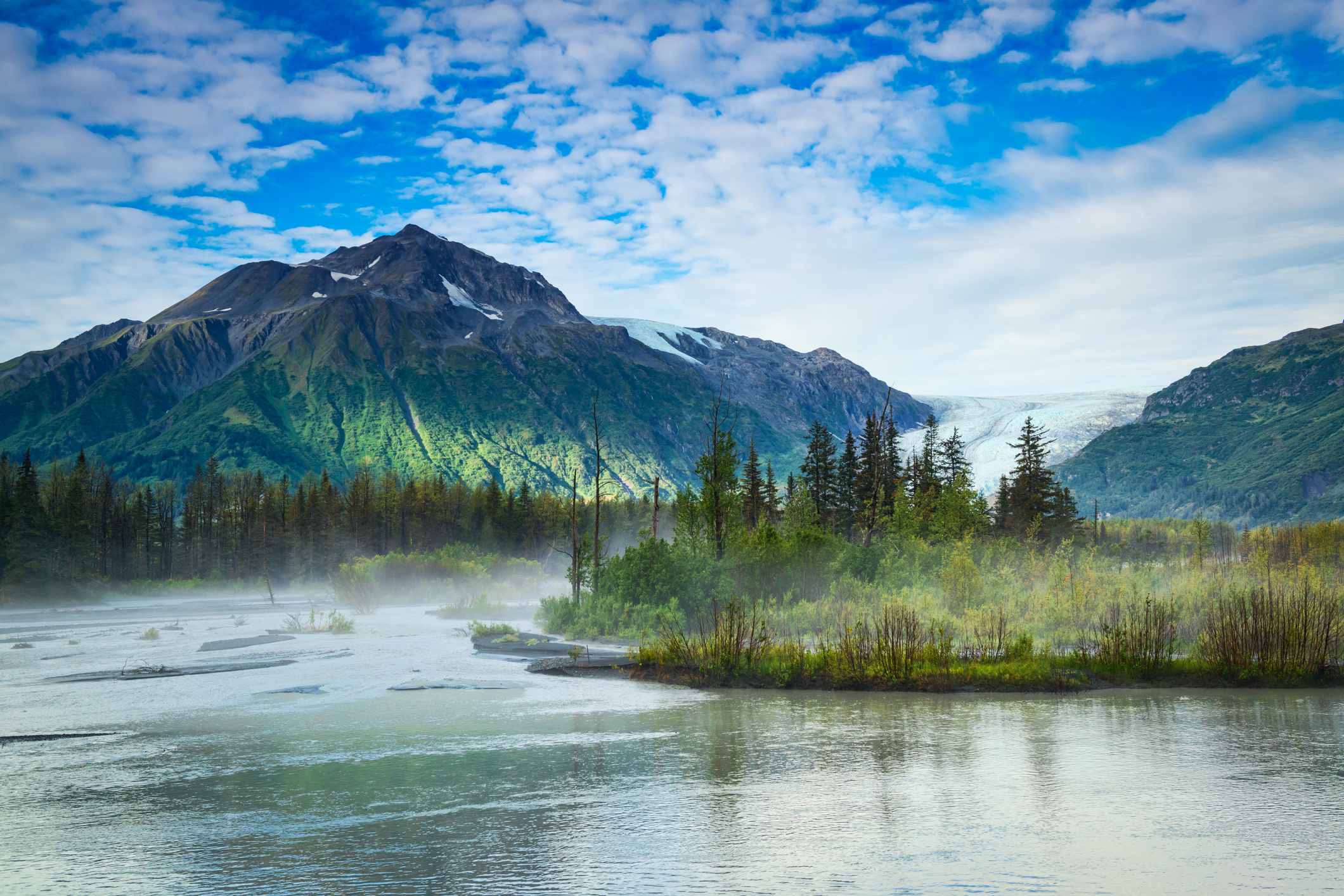 Incredible landscape in foggy morning of Ghugach forest in Kenai peninsula of Alaska, USA. Exit Glacier on background.