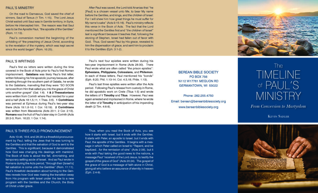 Here at BBS, our friends often give us ideas and suggestions for new literature via phone calls, letters, and emails. Last year, I spoke on the phone with Brother John Lynch in Idaho, and we had a great conversation around the Word of God, rightly divided. During the course of the call, John recommended that BBS produce a timeline chart of Paul’s ministry and the Book of Acts. He felt it would be helpful for people to have a visual depiction of when the important events took place in Acts, the dates and locations of Paul’s travels, and when and where Paul’s letters were written. I thought John had a tremendous idea.
